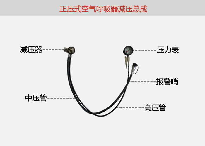 減壓器:減壓器可將氣瓶內(nèi)的30mpa高壓空氣減壓至0.5-0.8mpa,減壓器內(nèi)安裝有中壓安全閥,萬一減壓器失靈,可自動排氣,保證使用人員的安全,減壓器上還具有安裝他救接口的備用螺孔。